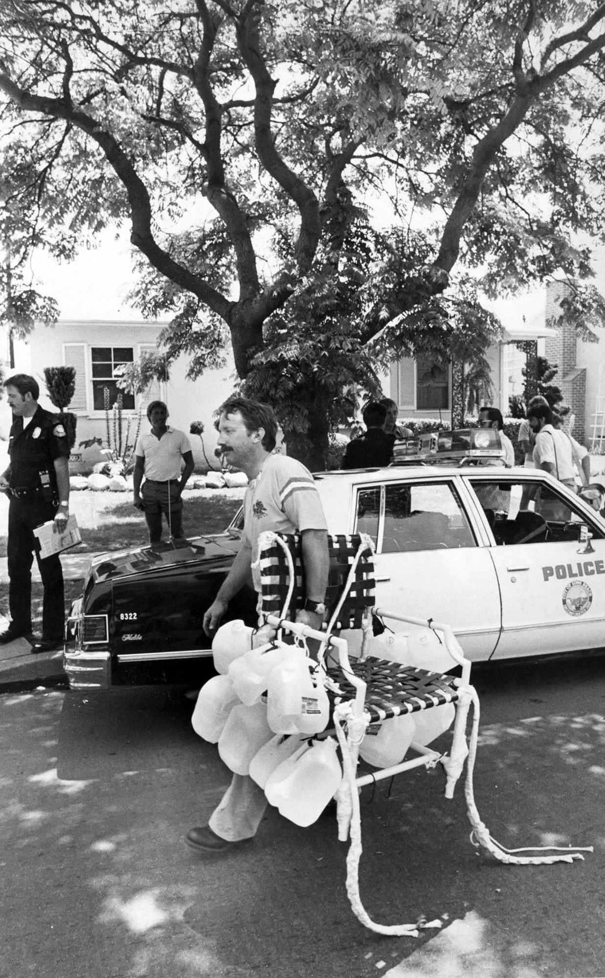 Walters feared he might drift out to sea. He finally gathered the nerve to shoot several balloons with his pellet gun to initiate a descent. After shooting a few, he accidentally dropped the gun overboard. The chair slowly lost altitude. As he approached the ground in a residential neighborhood of Long Beach, the dangling cables of his balloon cluster entangled with high-voltage power lines.