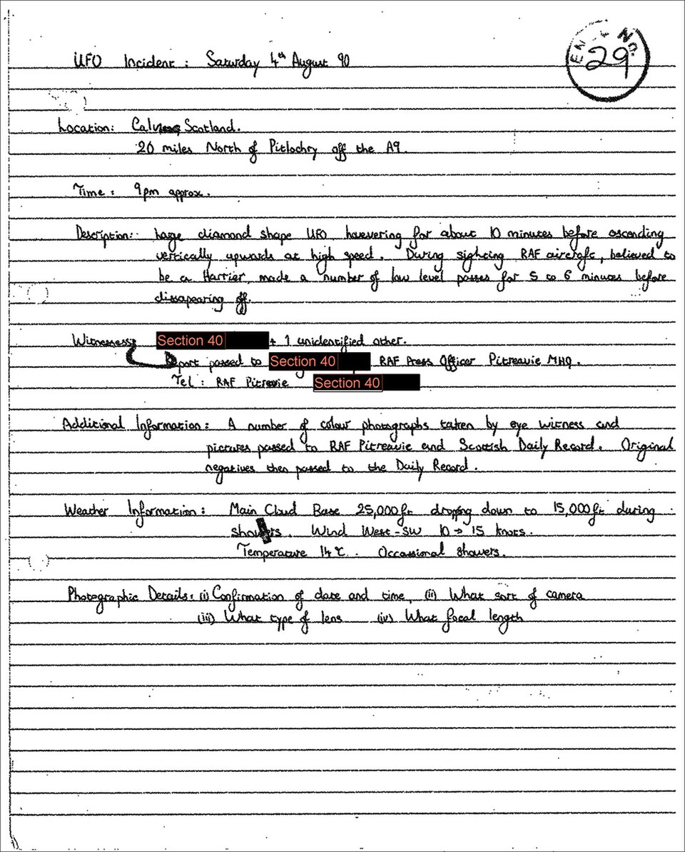 On August 4, 1990, two hikers walking across the isolated moors above the hamlet of Calvine in Perthshire, Scotland, encountered a massive, diamond-shaped object hovering silently in the evening sky. Fearing for their safety, the men hid inside a nearby grove of trees and watched the unknown craft for 10 minutes.