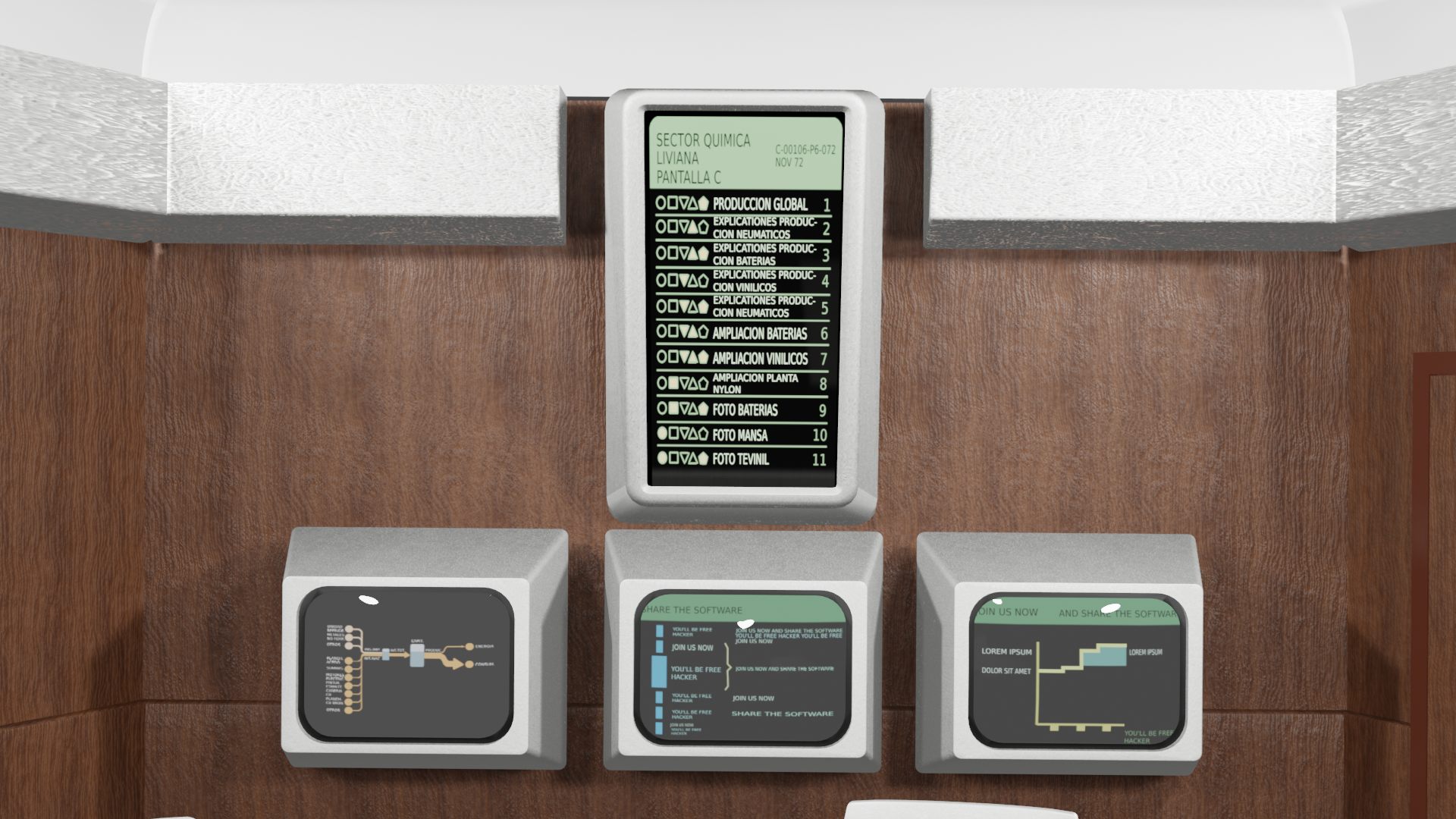 The armrests featured custom control buttons that allowed occupants to navigate large screens on the walls. These screens displayed graphs, real time alerts, and economic indicators. Planners intended for managers to sit in this room, review the data, and make rapid economic decisions based on the information projected around them.