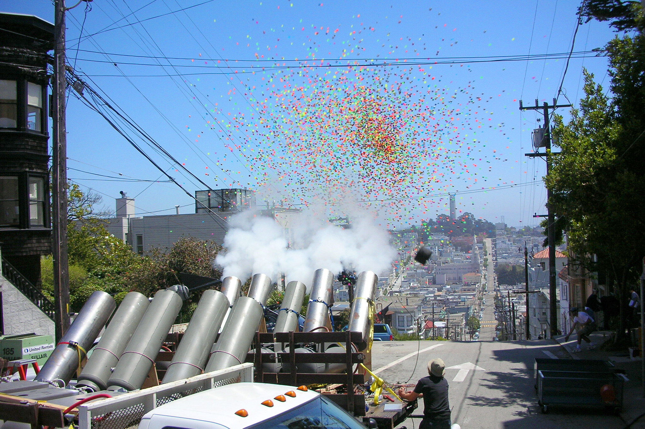 Rolling the spheres would not generate enough momentum on the angled streets. Special effects specialist Barry Conner designed a proprietary mortar system to launch them into the air. The crew bolted six truck-mounted air cannons into the asphalt at the intersection of Filbert and Hyde streets.