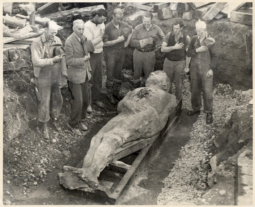 He told locals he planned to build a monument for Abraham Lincoln. Hull transported the stone to a Chicago workshop and hired sculptors to carve a giant. He hammered knitting needles into the stone to mimic skin pores and poured sulfuric acid over the surface to create an aged appearance.