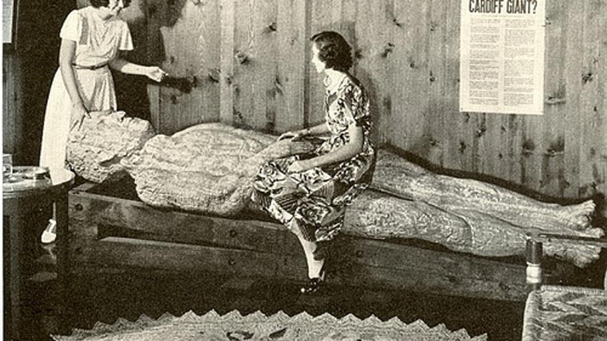In October 1869, two workmen digging a well in Cardiff, New York, struck something hard 3 feet (0.91 meters) below the surface. They uncovered a massive stone foot and eventually unearthed a 10-foot-tall (3.05-meter) petrified man. The figure lay with contracted legs and a hand pressing its abdomen.